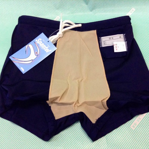 サイドにラインなどはなく、無地の短パンタイプの水着です。