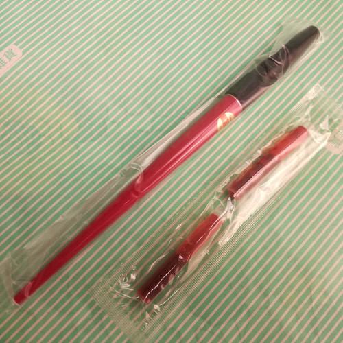 デスクペンの本体1本と赤色インクカートリッジ2本のセットとなります。