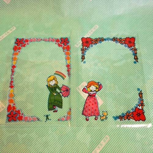 透明なビニールのカバーで、女の子のイラストが、裏、表に一人づつ描かれています。1袋に3枚入っています。